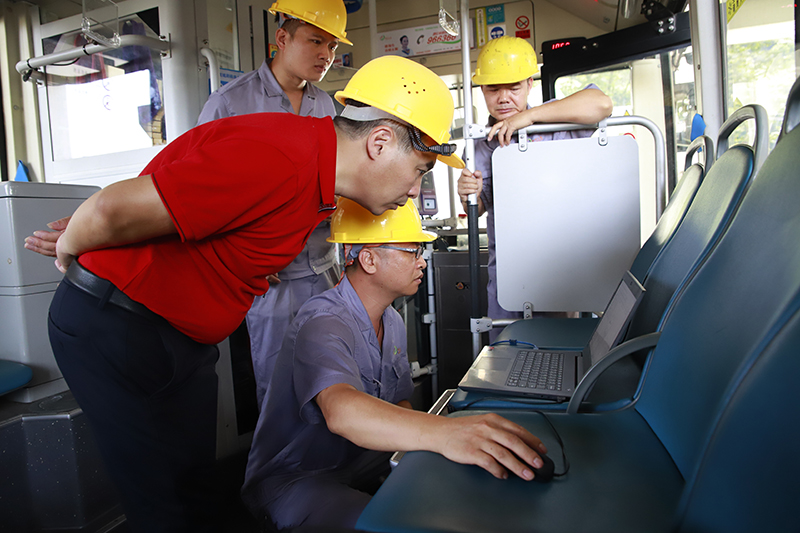 比赛分为理论考试和实际操作两个部分,分别占比赛总成绩的25%和75%。 理论考试采取闭卷形式,结合实际,题目设置重点对新能源公交车“三电”系统的基础理论、原理构造等内容进行考核,进一步夯实青工们的维修理论基础,助力其将所学所悟应用于实践,所思所练检验于实操。