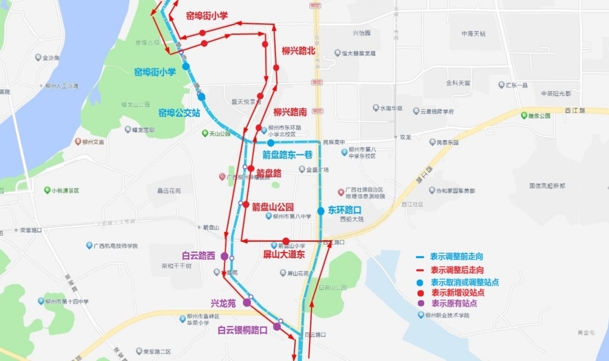 (二)站点设置:取消“东环路口、箭盘路东一巷、窑埠公交站”停靠站,将“窑埠街小学”停靠站从蟠龙路迁移至龙静路上停靠,增设“柳兴路北、柳兴路南”停靠站,恢复“屏山大道东、箭盘山公园、箭盘路”停靠站。
