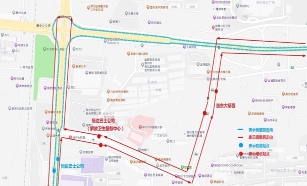 (二)站点设置:将“恒达巴士公司”停靠站从跃进路迁移至三中路停靠,并命名为“恒达巴士公司(解放卫生服务中心)”站,增设“壶东大桥西”停靠站。
