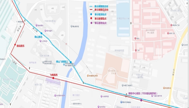 (二)站点设置:取消“鹅山飞鹅路口、鹅山路东”停靠站,增设“飞鹅路西、南站路东”停靠站。