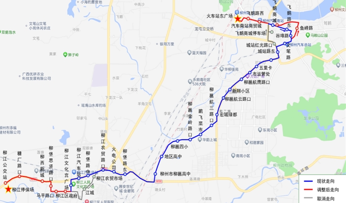 (二)站点设置:新81路取消“江城、柳江农贸市场、城站红光路口、飞鹅商城停车场”停靠站,增设“柳江公交站,糖厂路口、柳西新城、柳堡思贤路口、马平路口、柳江区政府、鱼峰路、飞鹅商城、汽车南站商贸城、飞鹅路西”停靠站。